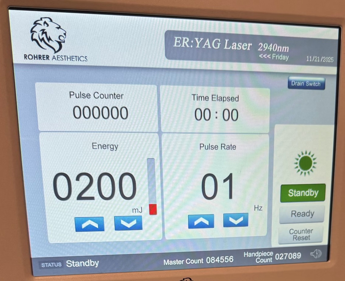 • 2940 nm Erbium Yag – for Laser Skin Resurfacing and Fractional Resurfacing – Pulse Count: 27,089;