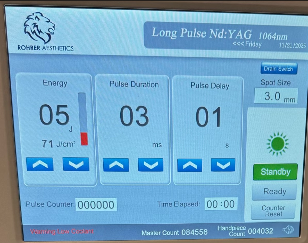 • 1064nm Long Pulsed Yag with Spot Size Attachment – for Vein Removal – Pulse Count: 4,032;